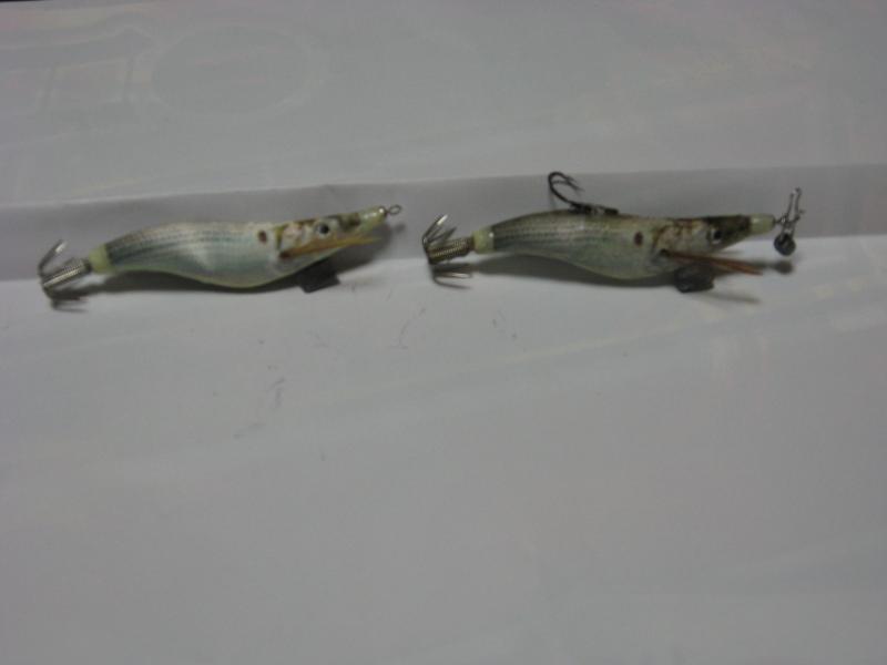 左のエギはノーマルで右は背中にマス針を付けて横抱き